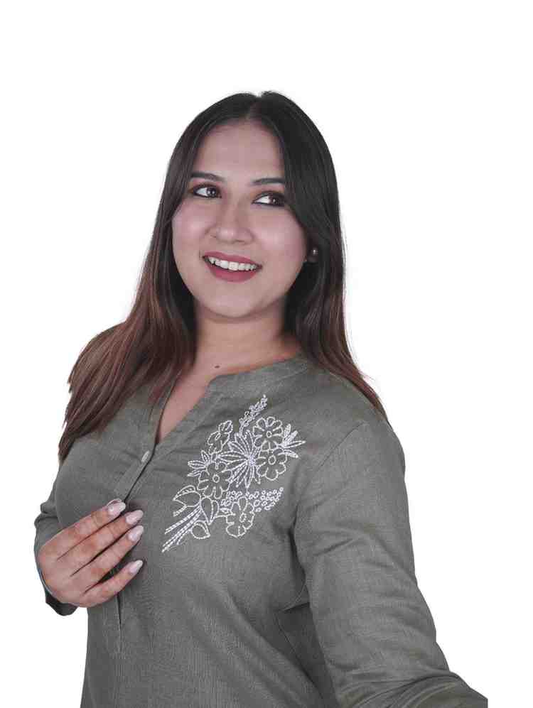 Crafted with care by Printique Fashion, a brand committed to pure, breathable fabrics made in India—this calf-length dress is a blend of comfort and elegance. Made from 100% pure linen, it features delicate white floral embroidery on the yoke, a flattering high-low hem, side slits, and 3/4 sleeves. A timeless silhouette perfect for workdays, brunches, or casual evenings.